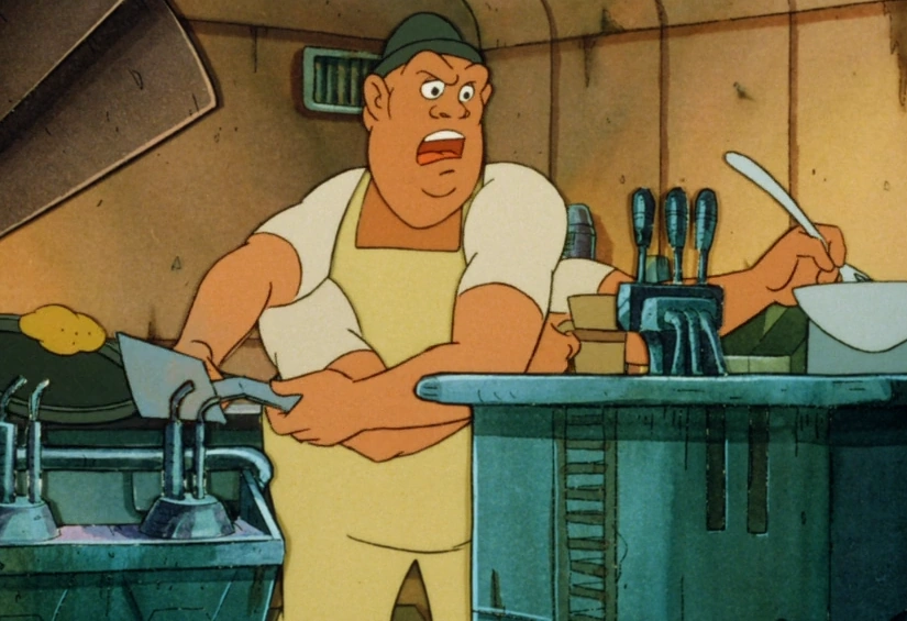 When the droids arrived at the eatery one morning, Sharpelz immediately put them to work.[3] He grew frustrated when the two had trouble remembering orders, repeatedly tripped over each other,[4] and proved to be the worst waiters that the locals had ever seen.[10] Late in the day,[3] C-3PO spilled some powder on Sharpelz's face, and the chef angrily sent him to serve Zellock. When the crime lord's henchman Yorpo Mog tripped over R2-D2 and landed in Zellock's food, Mog threw the astromech across the café. R2-D2 crashed into both C-3PO and Sharpelz, and the chef responded by immediately firing his new waiters, tossing them out into the street, and telling them never to return.[4]