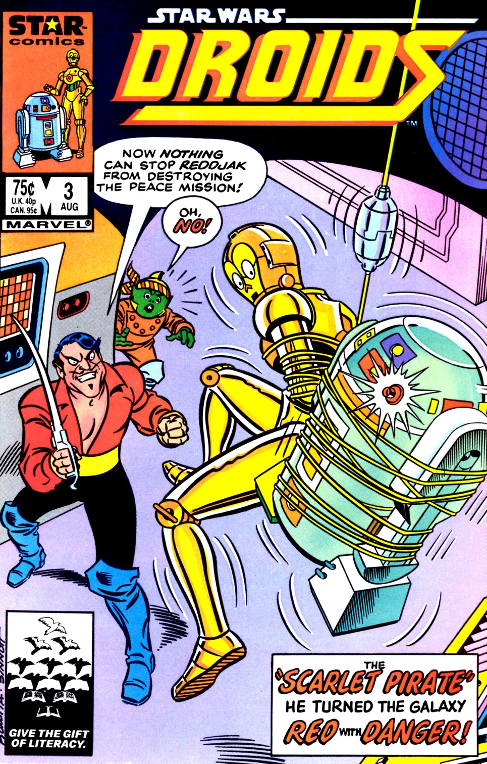 Droids 3 is the third issue of the Star Wars: Droids series of comics. The story is split into two chapters, "The Scarlet Pirate Part 1" and "The Scarlet Pirate Part 2: End of the Game." The issue was published on May 13, 1986 by Marvel Comics.[1]