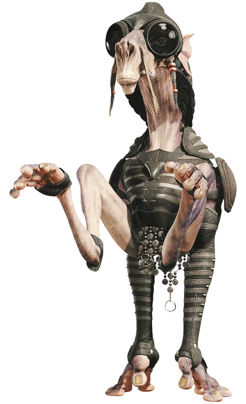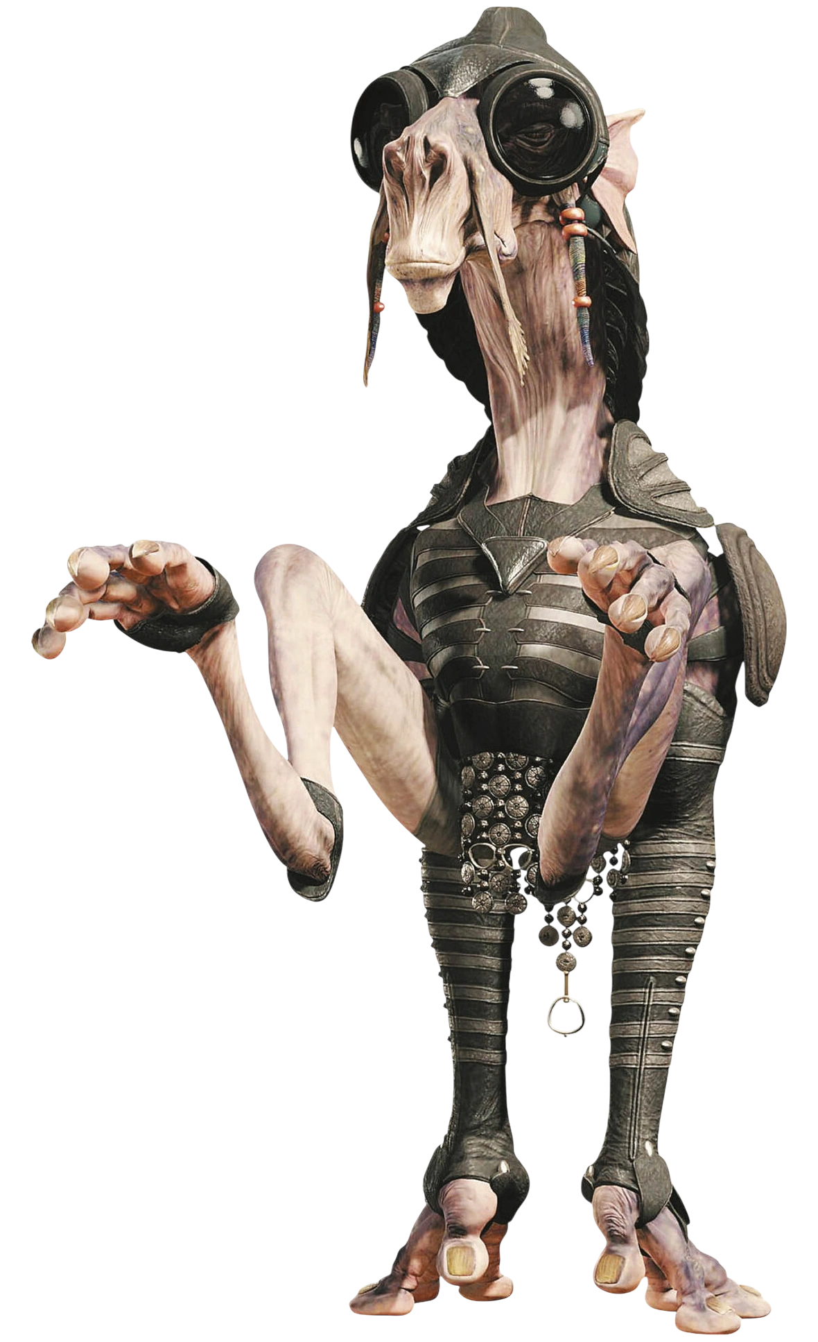 The Dugs were a sentient[1] species from the planet Malastare.[10] They were easily identified by their long snouts and the fact that they walked using their arms. On Malastare, the Dugs were ruled by the Dug Council, which during the Clone Wars was headed by Nakha Urus, who held the title of Doge. Some Dugs were known to travel off-world in order to seek lives off of Malastare. The pilot Sebulba became a well known and feared Podracer pilot, while a Dug named Preigo headed a popular circus. Dugs could also be found on the worlds of Coruscant and Tatooine.