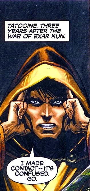 The character of Duron Qel-Droma was first introduced in the 2003 video game Star Wars: Knights of the Old Republic. In the game, Qel-Droma appears only as a skeleton in the Shyrack cave of Korriban, which can be found by the player character, Revan. On Qel-Droma's body, the player can find the Qel-Droma robe and Qel-Droma's datapad.[5] Qel-Droma's backstory was greatly expanded upon in the comic "Shadows and Light," one of the stories featured in 2005's Star Wars Tales 23. The story serves as a sort of prequel to Knights of the Old Republic, telling the story of how Qel-Droma ended up as a corpse on Korriban. In the comic, Qel-Droma was illustrated by Dustin Weaver.[2] Several other mentions of Qel-Droma have been made in the Star Wars canon. Qel-Droma was mentioned in a Codex entry in the MMORPG Star Wars: The Old Republic,[6] to go along with mentions in the reference book The New Essential Chronology[4] and the Knights of the Old Republic Campaign Guide.[1]