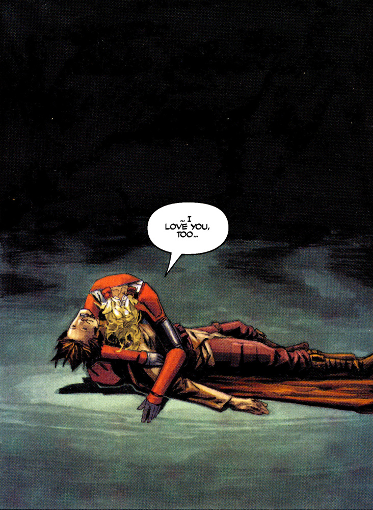 Duron Qel-Droma lies dead in Shaela Nuur's arms.