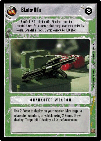 The BlasTech Industries E-11 blaster rifle, also referred to as the E-11 BlasTech Standard Imperial Sidearm,[3] the Stormtrooper Armament Blaster Rifle (BlasTech E-11),[4] and the E-11 Military Issue Blaster Rifle,[5] was a blaster rifle used during the time of the Galactic Empire. It was the standard-issue blaster rifle of the Imperial stormtroopers. A powerful, light and compact weapon, the E-11 was used widely throughout the galaxy for nearly a century and a half.