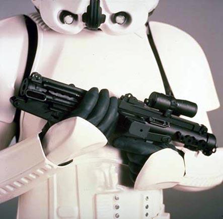 A Return of the Jedi E-11 pictured with a Sterling submachine gun from which the A New Hope and Empire Strikes Back version was designed