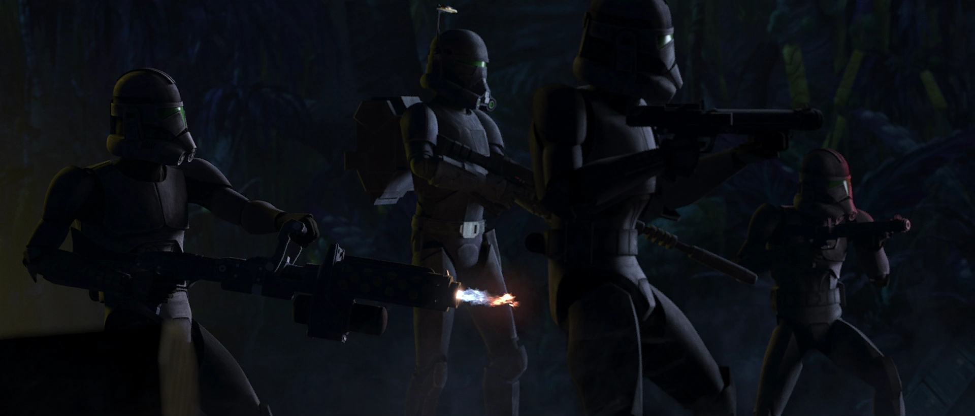 Arriving at Onderon aboard a Nu-class attack/transport shuttle, ES-04 and her squadmates entered the planets jungles and located the camp of fighters, though Gerrera himself was absent. As Crosshair led the main unit in a frontal assault on the insurgents, ES-04 flanked the enemy with a BT X-42 heavy flame projector and took out several fighters as they retreated towards an LAAT/le patrol gunship. Her next target, the occupants of the gunship's cabin, were spared from her stream of fire when the ship's pilot sealed the vessel's hatch doors. A well placed shot from an Elite, however, took the pilot out and left the ship defenseless.[3]