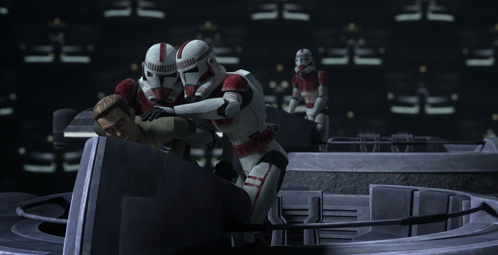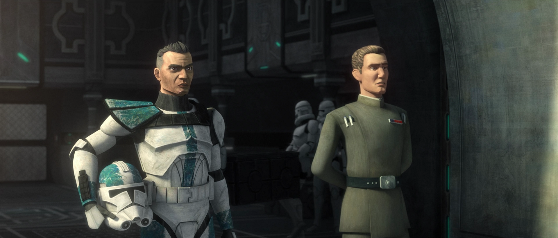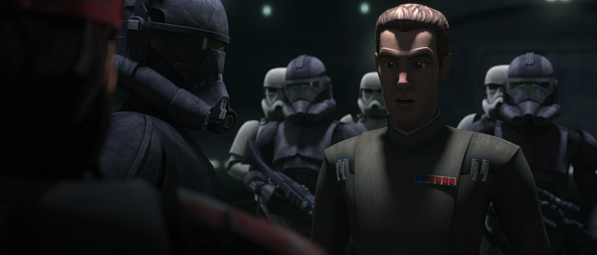 After the successful escape from Erebus, Rampart accompanied Clone Force 99 to a cloning facility on Bora Vio, where they met up with Echo, who had stolen an Imperial shuttle for their mission. Rampart revealed that Hemlock kept Tantiss' location secret, but any ships going there would have to be cleared by Imperial Station 003 above Coruscant. He wondered how the clones would be able to infiltrate the station in their current state, noting that the codes changed every rotation. The clones decided that they would infiltrate the station as Imperial soldiers, with Rampart leading them as a captain. Rampart was handed a stolen Imperial captain's uniform, much to his dismay, as he found the captain's rank too lowly due to his former vice admiral status. Echo countered that he had already been demoted, prompting Rampart to groan and state that he hated working with clones.[26]