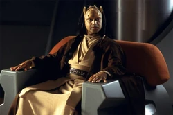 Around this time Master Koth and Master of the Order Mace Windu entered into the Concordance of Fealty, exchanging their lightsabers for a duration of time as an act of trust.[9] Koth was on Coruscant soon after when Master Jinn brought news of a tattooed Zabrak assassin that had attacked him on Tatooine. The assassin was highly skilled with a lightsaber and wield the Force as a weapon, leading Jinn to believe that the man was a Sith Lord. Startled by this revelation, the Council was even more surprised by Jinn's claim to have discovered a vergence in the Force, centered around a boy named Anakin Skywalker. The Council agreed to test the boy and judge whether he would be trained; while Master Koth saw himself in the nine year old, the majority of the Council voted that Skywalker was to old to begin the training. When reports came in that Master Jinn had been slain on Naboo by the Zabrak assassin, Koth and the majority of the Council traveled to the world for his funeral and to be briefed by his surviving Padawan. Padawan Kenobi detailed the duel fought between Jinn, the Zabrak, and himself, leaving little doubt that the Dark Sider was indeed a Sith. While Kenobi managed to kill him the Council was deeply disturbed that the Sith had survived and decided to knight Kenobi and appoint Skywalker as his apprentice.[10]