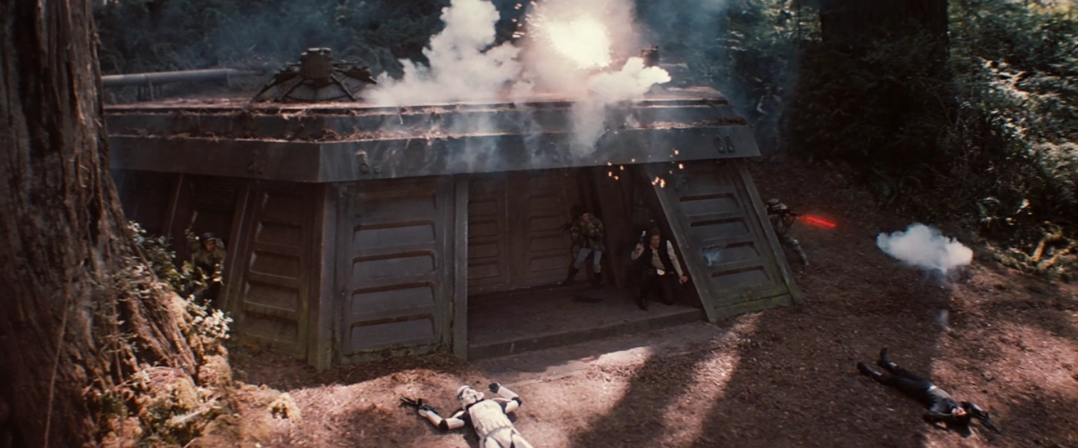 The next day, Solo, Organa, Chewbacca, and the droids regrouped with the rest of the team and made their way to a back entrance of the shield generator bunker. When an Ewok, Paploo, stole a speeder bike, all of the scout troopers guarding the entrance gave chase, but one. The trooper was captured by the Rebels, with Sant taking his armor and resuming the trooper's position in front of the entrance. The team entered the bunker and quickly captured the control room, however, in a trap set by Emperor Palpatine, Imperial reinforcements arrived and quickly captured the Rebels. Suddenly, Ewoks who had been hiding in the nearby brush attacked, resulting in total chaos and giving the Rebels enough time to destroy the shield generator bunker.[1]