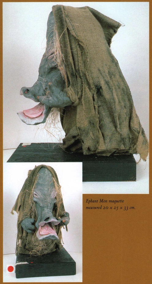 Ephant Mon was created for the 1983 original trilogy film, Star Wars: Episode VI Return of the Jedi,[15] although prior to the film's release he appeared in its Star Wars Legends novelization, which was written by James Kahn.[18] A maquette of the character was made which measured 20 centimeters by 25 centimeters by 33 centimeters.[19] The character's costume consisted of a giant foam rubber construct that was worn as a full-body suit[20] by puppeteer Andy Cunningham.[21] The mask consisted of an armature covered in plaster with clay sculpted over the top by Tony McVey.[22]