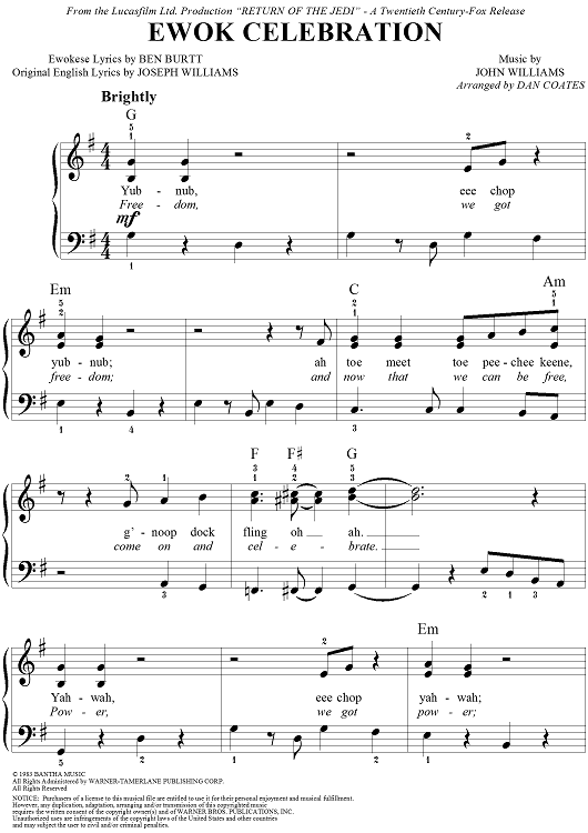 The "Ewok Celebration," commonly known as "Yub Nub," is a 1983 song featured in Star Wars: Episode VI Return of the Jedi. It was published by Bantha Music and is administered by Warner-Tamerlane Publishing Corporation.