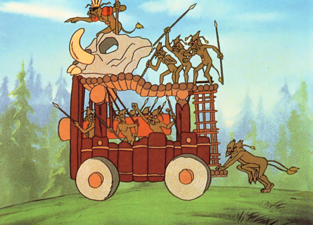 Loaded with Dulok warriors, King Gorneesh, Queen Urgah, the shaman Umwak, and Murgoob, the war wagon rolled out. The Duloks first attacked a group of picnicking woklings, whom Warrick warned about the impending Dulok assault on the Soul Trees. The young Ewoks escaped to alert the village, so by the time the Dulok war party reached its target, a line of Ewoks led by Chief Chirpa and the shaman Logray met them, determined to defend the Soul Trees to the last. Undeterred, Gorneesh ordered the Duloks to accelerate the wheeled weapon to ramming speed.[1]