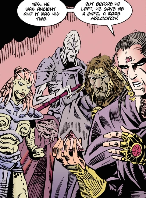 Exar Kun shows the Dark Holocron to his new Jedi students.