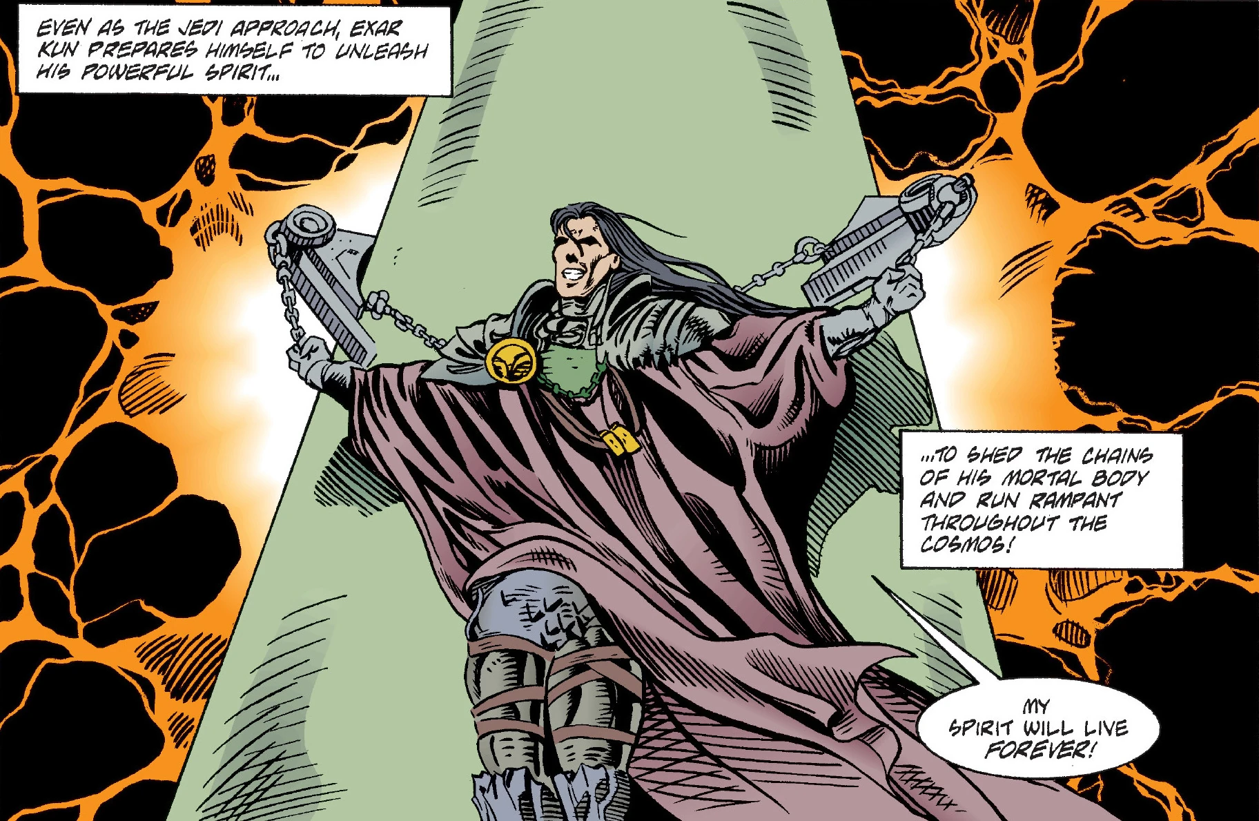 Exar Kun was a Human male Jedi Knight who fell to the dark side, assumed the mantle of Dark Lord of the Sith, and waged a destructive war against the Galactic Republic and Jedi Order during the era of the Old Sith Wars. Kun was apprenticed to the respected Jedi Master Vodo-Siosk Baas, and in his days as a student he came across forbidden knowledge of the history of the Sith. Extremely confident in his abilities and naturally quick to anger, Kun was filled with a burning curiosity regarding the Sith and soon went on his quest to find out as much as he could. Kun's search led him to the planet Onderon, which had once been ruled by a Sith Lord named Freedon Nadd. With the help of a pair of Nadd's followers, Kun came across Nadd's tomb on Onderon's moon Dxun, and there was confronted with the spirit of the dead Sith himself. Seeing in Kun a potential avenue to regain a physical form, Nadd directed the young Jedi to the ancient Sith homeworld of Korriban. There, Nadd conspired to grievously injure Kun, only healing the man when he accepted the dark side into his heart. Kun's next stop was to the moon Yavin 4, a place with its own Sith history—Kun enslaved the primitive Massassi living there and compelled them to build extensive temple complexes across the forested world. Soon afterward, the fully corrupted Kun banished Nadd's spirit, having never trusted the old Sith, and in the process learned of several other nascent dark side users who had learned from Nadd.