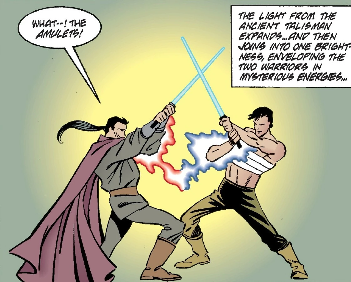 Exar Kun battles Ulic Qel-Droma in the Iron Citadel.