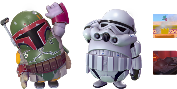 During Fall Guys' first Star Wars collaboration, multiple cosmetic items based on the original trilogy, specifically[11] the 1980 film[19] Star Wars: Episode V The Empire Strikes Back and[11] the 1983 film[19] Star Wars: Episode VI Return of the Jedi, were added to the in-game shop. Characters such as[11] the smugglers[20] Han Solo and Chewbacca, with the former riding atop the starship Millennium Falcon,[11] the bounty hunter[20] Boba Fett, and a stormtrooper were available as costume sets. Along with the costumes, two victory celebration sequences based on Solo's carbon-freezing process from Episode V and Fett's fall to the Great Pit of Carkoon from Episode VI were added to the in-game shop as well.[11]