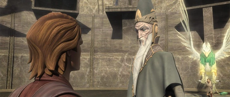While the Son flew off to retrieve the Dagger of Mortis, the Father approached Anakin Skywalker and asked him what his Son had showed him. Skywalker replied that he saw an apocalyptic vision of his future self. The Father then said that the future is not set in stone, then proceeded to erase Anakin's vision, and took him back to his monastery.[4] Once there, Anakin woke up, and asked the Father what had happened, and the Father said that his Son had broken the laws of time, and showed him what he should never have seen; then, Kenobi and Ahsoka Tano arrived at the monastery, followed by the Son in person. Upon his arrival, the Father tried to convince him to restrain himself and stay, but his Son refused, and was immediately attacked by the Chosen One, followed by Obi-Wan Kenobi and Ahsoka Tano, but they were not strong enough to stop him.[4]