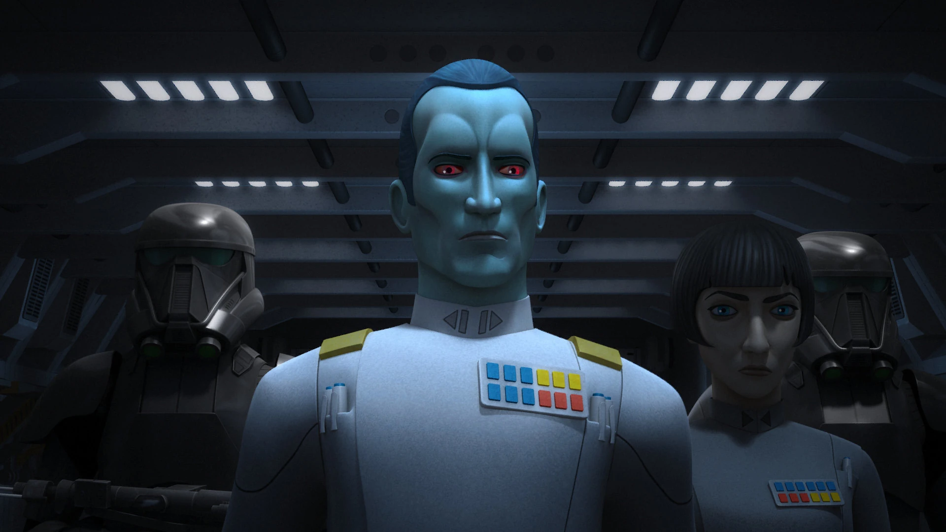 The two Spectres sneak onto the base, with two Loth-cats in tow. They observe the prototype Elite, noting it is guarded by two stormtroopers. Ezra suggests that Sabine create a distraction so she can sneak aboard. Before she can, however, the Loth-cats emerge from behind the crates the rebels are using as cover and approach the guards. Seeing this, Ezra tells Sabine that the cats are handling it. The stormtroopers, irritated at the animals' presence, wonder if they can fly. One of the troopers shoots at a cat, which jumps out of the way. As the troopers agree that Loth-cats can't fly, the animals, angered, attack them. The cats then flee, with the troopers in pursuit. Sabine notes she likes the cats more and more, before asking Ezra to keep watch while she sneaks aboard the Defender. As Sabine begins to extract the flight recorder, Zeb contacts her and Ezra to report a ship approaching from the south. Skerris meets the Sentinel-class landing craft as it arrives at the airfield. Ezra, in his hiding place, looks over and is horrified to see Grand Admiral Thrawn and Governor Arihnda Pryce exiting the shuttle. Sabine asks Ezra, over the comms, what's happening, and he tells her "something terrible." Ryder notes, horrified, that Sabine is still in the Elite, and Zeb responds that things are about to get interesting.