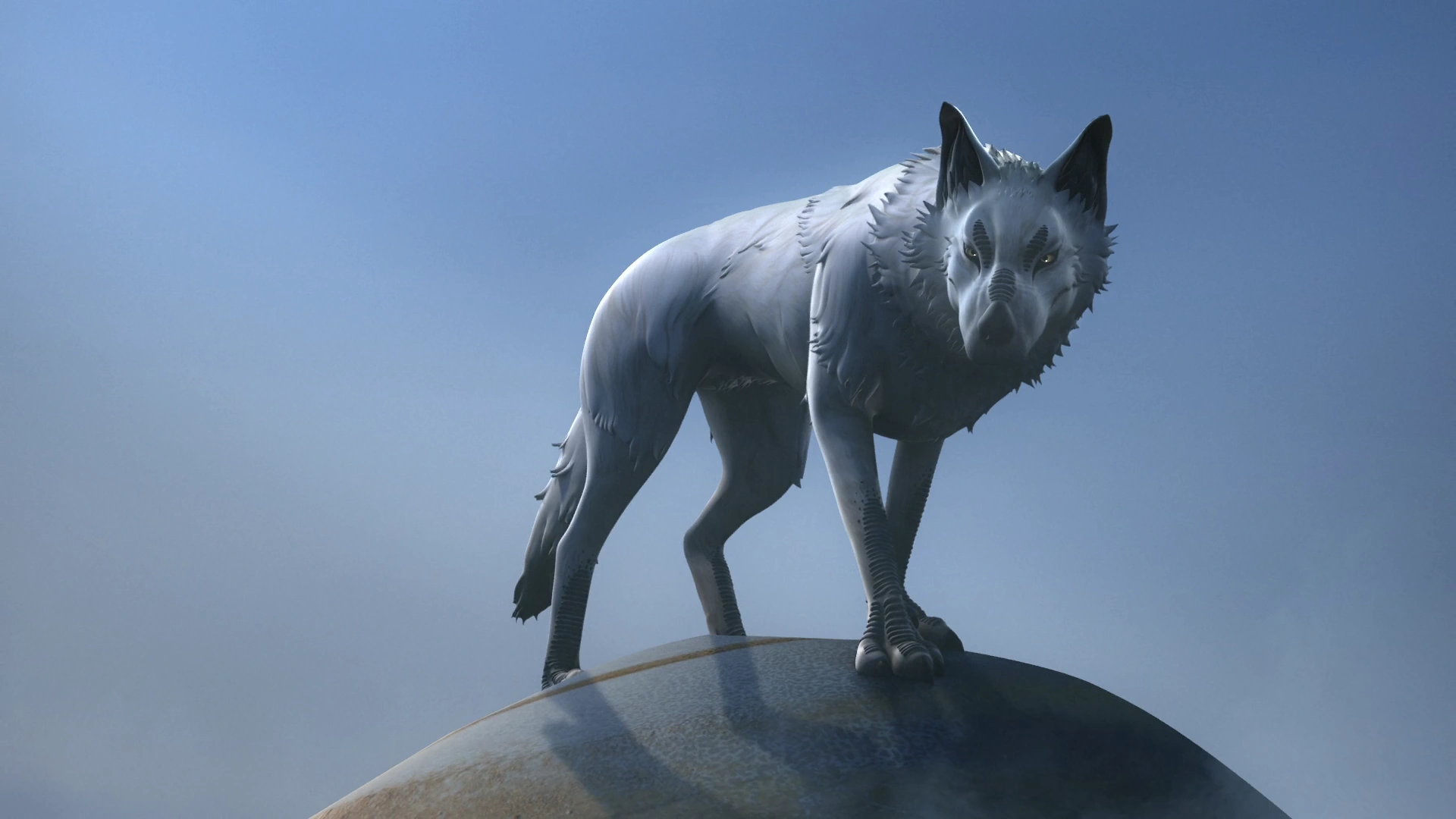 Ezra and Sabine, carrying the flight recorder, are forced to hide from the searchlights of Imperial gunships. Sabine insists that they have to keep moving. Ezra sees the Loth-wolf again, but Sabine doesn't. She recalls it as a creature depicted in cave paintings, and Ezra explains that it was native to Lothal, but that no one's seen one in a hundred years. At this point, the Loth-wolf comes up behind Sabine, and Ezra, nervous, gets her to turn around. The wolf puts her to sleep before looking at Ezra, who asks what he did to Sabine and reaches for his lightsaber. The white Loth-cat appears on the wolf's head, reassuring and surprising Ezra. When Imperial gunships appear in the distance, the wolf and cat growl, and Ezra notes that they don't like the Empire either. Ezra tells the wolf that the gunships are searching for them, and he offers him and the sleeping Sabine a ride. Putting Sabine on the wolf's back, Ezra then picks up her helmet and the data recorder and climbs on as well. The wolf runs, avoiding searchlights, and Ezra looks back as they flee before thanking the creature.