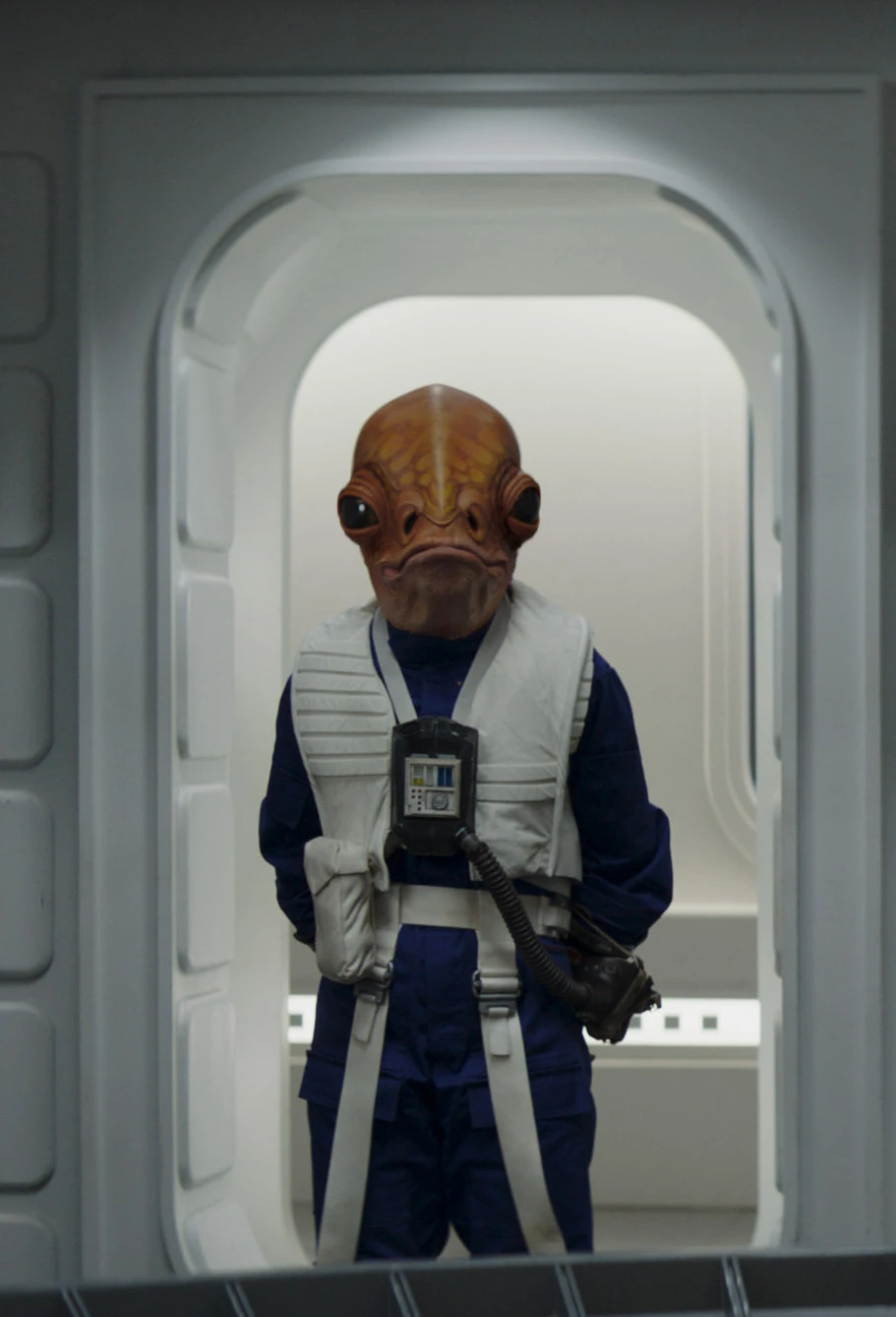 A Mon Calamari in a blue New Republic flight suit