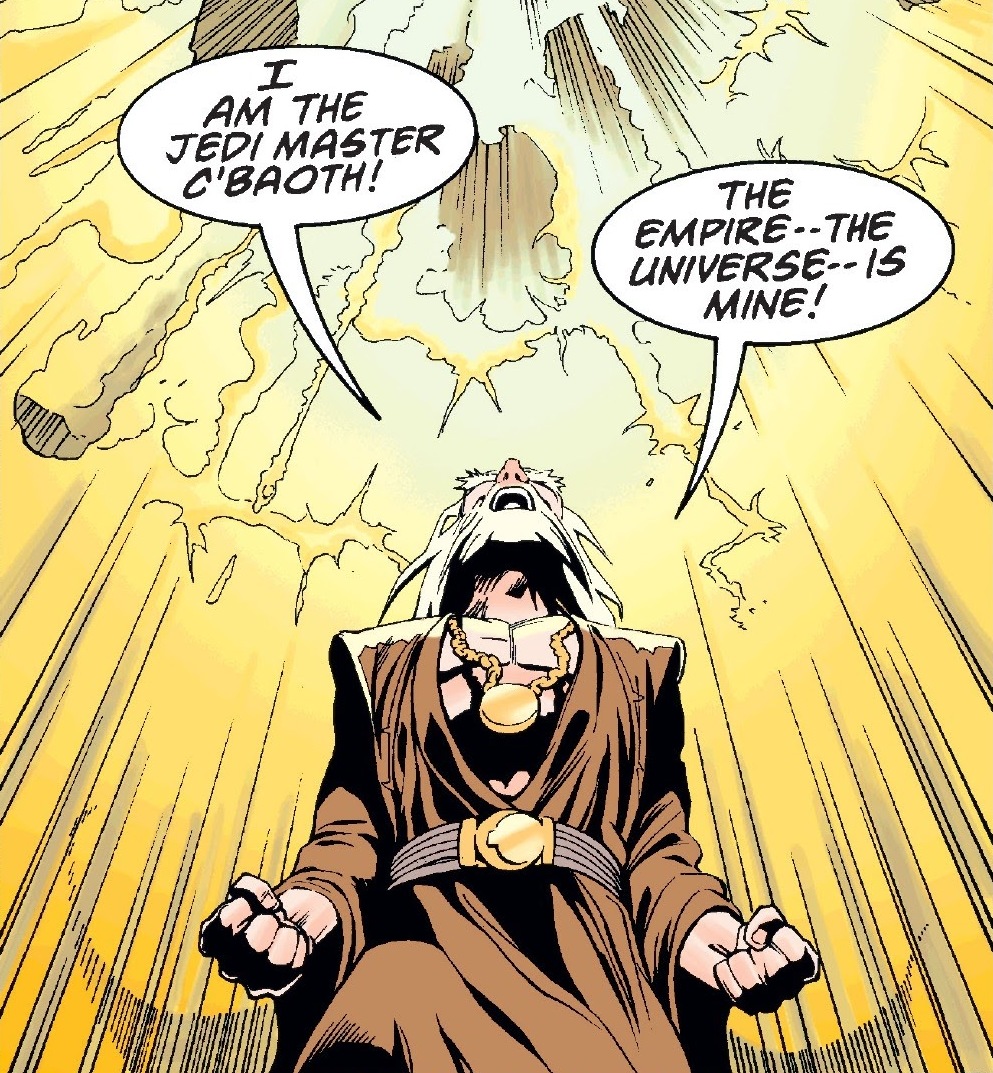 Joruus C'baoth emits screams during his face-off with Luke Skywalker and Mara Jade