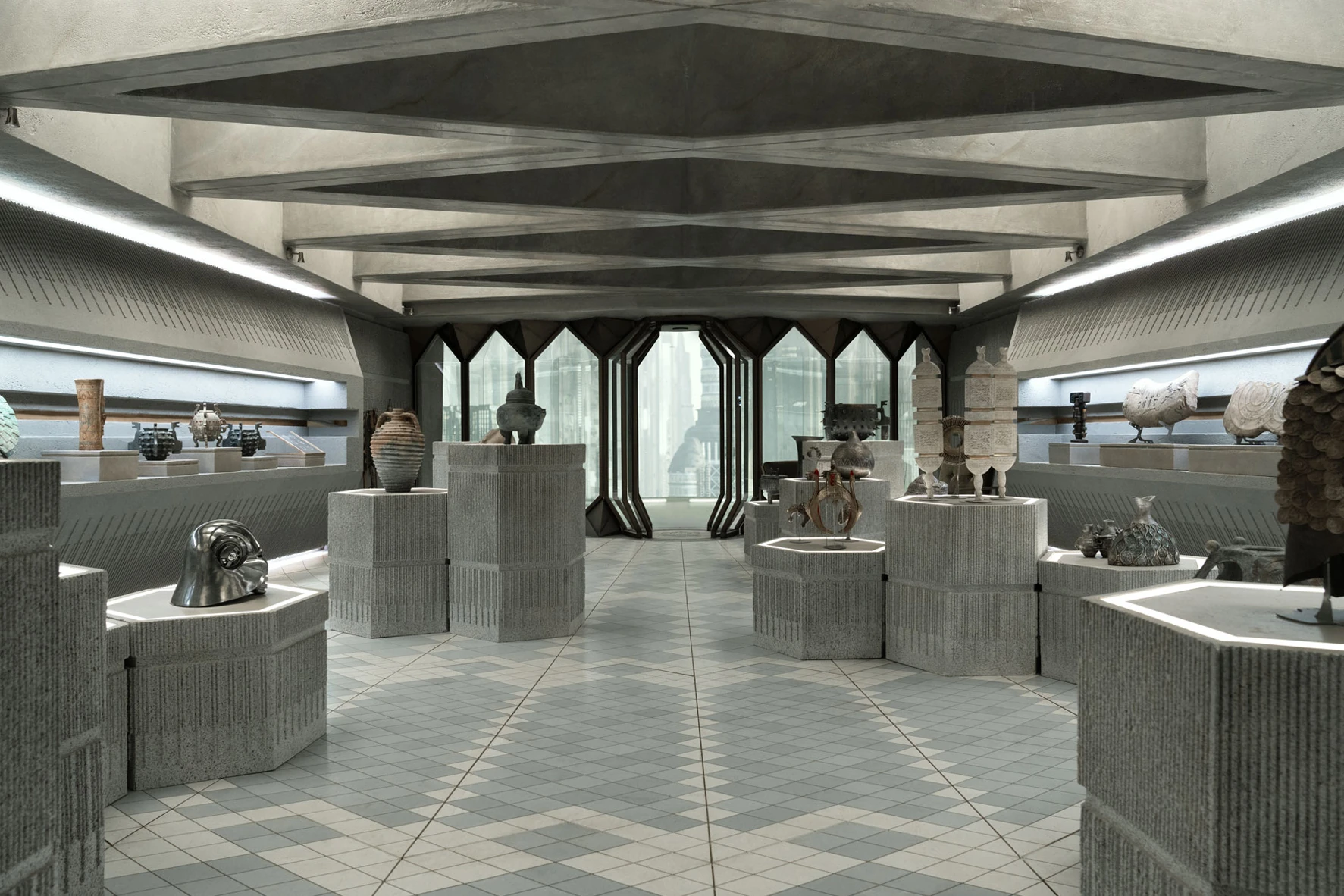 The gallery was designed by[9] production designer[3] Luke Hull. The gallery's public space and private area were meant to mirror Mon Mothma's public face and the private woman within her. The set allowed for creativity between Genevieve O'Reilly and Stellan Skarsgård, the actors who played Mon Mothma[9] and Luthen Rael, respectively.[1] Executive producer[3] Tony Gilroy was not aware of the antiquities that the art department put in the gallery.[11]