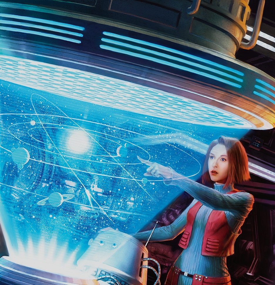 A mission commander visualizes the coordinates of a star system by using a hologram