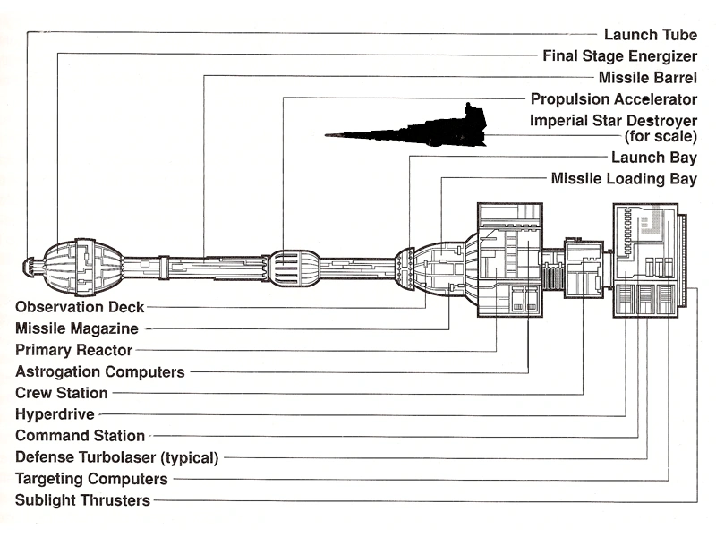 Each of these projectiles was capable of traveling through hyperspace with a speed equivalent to at least a Class .75 hyperdrive, allowing for quick traversal of interstellar distances and difficulty in detecting them until they struck. Upon exiting hyperspace and homing in on its target, the projectile's automated defenses would activate to deter enemy forces. Automated laser cannon turrets exchanged laser fire with warships while thick armor plating and powerful energy shields deflected even the most advanced ion cannons and turbolasers.