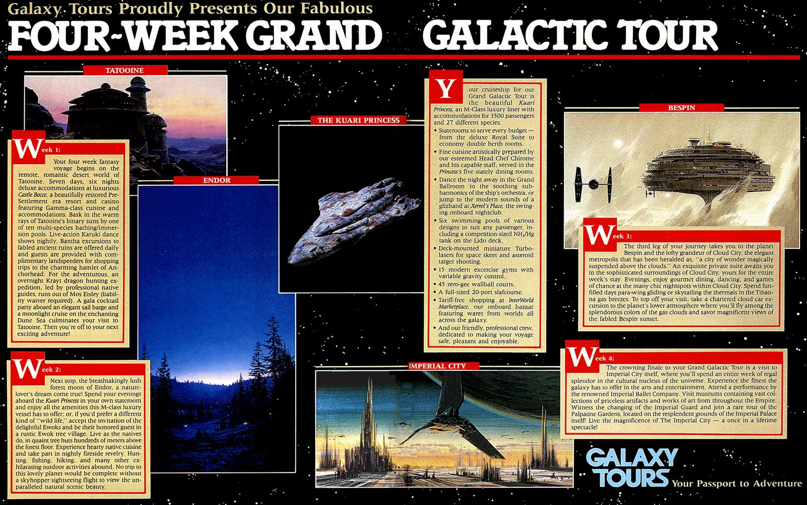 Sometime during the Galactic Civil War, prior to the Rebel Alliance retaking Coruscant, Galaxy Tours had the Grand Galactic Tour, which involved the Kuari Princess stopping at, in order of the weeks, Tatooine, Endor, Bespin, and Imperial City.[3]