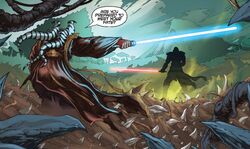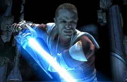 Starkiller focused entirely on the duel, ignoring all other factors as he hammered at Kota's defenses. He came to the conclusion that while Kota was wily, strong, and possessed certain unique moves, his age and his rejection of the dark side of the Force left him inferior. Kota twice attempted to regain the offensive, but only managed to tire himself out, and the Jedi began taking hits. Seeing that he was being driven back, Kota broke off and complimented Starkiller's skills before telekinetically wrenching the entire command center free of the shipyard and sending it plummeting into Nar Shaddaa's atmosphere.[3] As their battle renewed, Starkiller seized the initiative, telekinetically thrashing Kota with chunks of debris before physically assaulting him and throwing him to the ground. Before Kota could regain his feet, Starkiller was on him, initiating a bladelock. As their blades ground against one another, Kota experienced a Force vision of Starkiller's future, expressing shock at seeing himself as part of it. Unconcerned, Starkiller drove Kota's own blade into his eyes, blinding him.[3] As Kota stumbled backwards, Starkiller suddenly experienced his own vision, seeing his forgotten father in Kota's place, telling him to run. Pulling back, fearing that Kota was using a Mind trick of some sort, he gave Kota the opening he needed to escape. Kota dropped his lightsaber and unleashed a telekinetic blast that shattered the viewports of the command center. The drastic pressure change sucked out Kota, who dropped spreadeagled into the Nar Shaddaa atmosphere.[4]