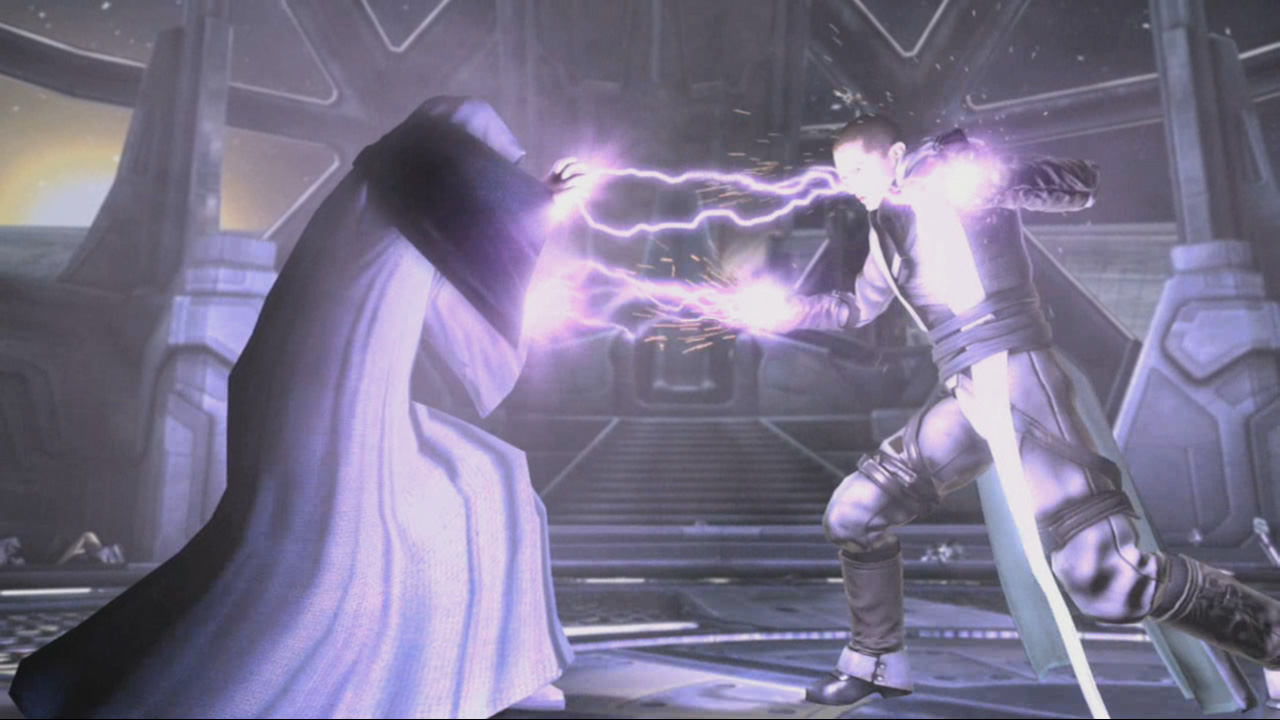 Within the command center, Starkiller encountered Rahm Kota. Both were surprised by what they saw. Starkiller had been taught that Jedi were soft from a life of privilege and hadn't expected the hardened soldier that Kota was; Kota had been expecting Darth Vader to come personally, not to send "a boy" in his stead. Starkiller opened the contest with a bolt of Force lightning which Kota deflected, albeit with difficulty. Starkiller followed up by charging, cutting at Kota's throat. The Jedi ducked and attacked the Darksider's legs, though Starkiller evaded by tucking in and over-leaping. Kicking himself off the nearest wall, Starkiller came on again, chaining a telekinetic blast into his attack. Kota deflected the push, the rebounding energy forcing both combatants apart. Readjusting his tactics, Starkiller circled more cautiously, cutting apart chairs with his lightsaber and blasting their fragments at the Jedi, attempting to provoke an attack. Kota suddenly charged, his speed and determination forcing Starkiller to rely on tight Form III defensive sequences to fend him off. Unable to penetrate this defense, Kota backed off and changed his style, fighting more slowly and deliberately, but chaining in sudden and devastatingly quick strikes, hoping to tire out Starkiller. However, this tactic backfired, and Kota's guard began to slip, allowing Starkiller to counter.[4]