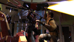 Informed by Eclipse via comlink that the command center had been stormed by Kota's militia, Starkiller made that his destination. With tactical updates from Juno, Starkiller carved his way through the facility, all the while the warring forces became progressively more alarmed by his presence. The militia forces thought he was some kind of Shadow trooper, while the stormtroopers merely thought him a Jedi. The militia forces became the primary focus of his rage due to their disloyalty to the Empire. However, he noted that many of the militia soldiers were equipped with explosives and had been setting them throughout the facility, motivating Starkiller to hurry before the entire facility was destroyed. Just then, the facility was crippled, and began falling out of the sky. Starkiller picked up the pace, now unceremoniously attacking his foes with telekinesis, either jamming their weapons or simply sweeping them aside. Reaching the entrance to the command center, Starkiller took a moment to center himself before entering.[4]