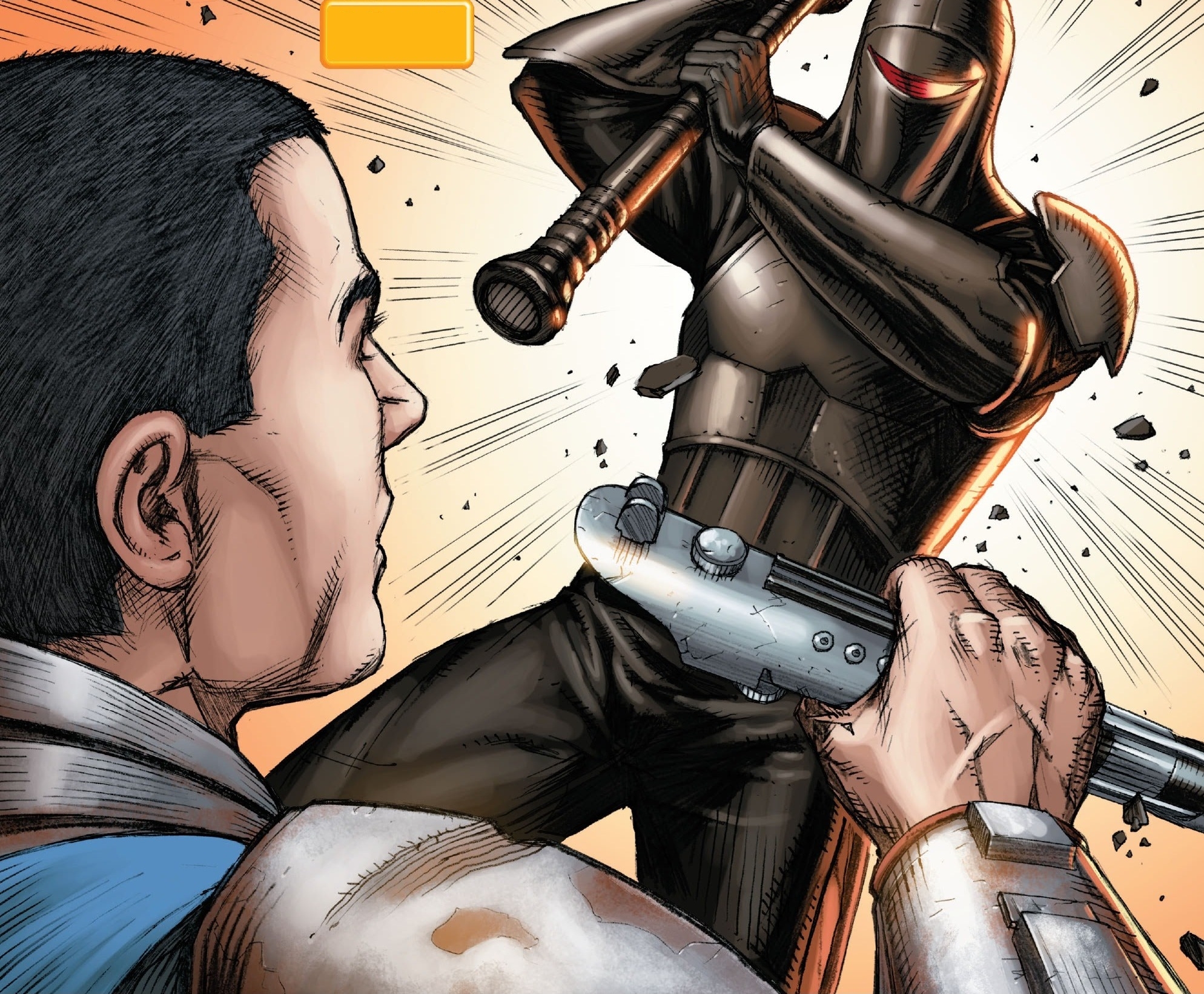 Succeeding where numerous combatants fail, the Apprentice kills Algol but neglects to claim the swords for his master. He returns to his own dimension where a disappointed Darth Vader Force chokes him for his disregard of orders. Angered by his pupil's defiance, Vader challenges him to a duel between master and apprentice. After a moment of uncertainty, the Apprentice accepts the challenge by activating his own lightsaber.[21]