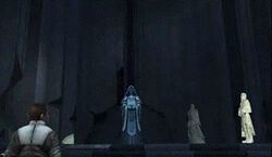 The hologram seized the immediate offensive, all the while gloating about the accomplishments of the original Darth Desolous.[8] However, Starkiller fought back ably, backing the simulacrum up against a statue of Palpatine erected at the head of the hall. Starkiller then telekinetically pushed the hologram up along the front of the statue before leaping up and throwing it back down. Standing on top of the statue, Starkiller destabilized it before leaping off, thus crushing the simulacrum beneath it and completing the trial.[3]