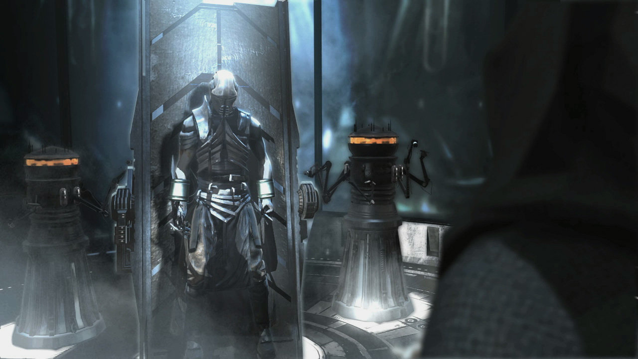 Cautiously ascending to the junk Temple's foyer, Starkiller was attacked by Kazdan Paratus' droid sentries. He made short work of them, being used to duels with a sophisticated droid like PROXY. Starkiller cleared the foyer by blasting the droids out of the Temple doors before being attacked by a massive junk golem. His battle with the golem tore through the junk Temple, eventually reaching Paratus' mock Jedi Council chamber, replete with mannequins of long dead Jedi Council masters. Starkiller disabled the golem and Kazdan Paratus then revealed himself, extricating himself from the golem's chassis, where he had been controlling it. Paratus was an Aleena, a small being, but compensated with a four-limbed mechanical harness on his back. With the limbs offering him extra height and mobility, Paratus was able to wield his lightsaber pike with deadly skill. The mannequins of the Jedi Council masters now activated, revealing themselves to be droids, and Starkiller was momentarily distracted by them.[4]