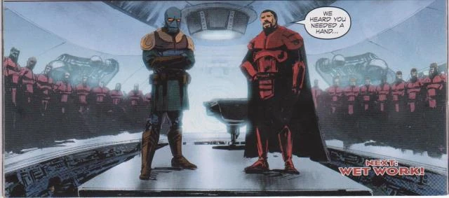 Meanwhile, Sith assassin Jor Torlin had been dispatched to the Wheel by Darth Maladi in an effort to find Cade Skywalker, the last known surviving Skywalker and son of Jedi Master Kol Skywalker. Unknown to the Sith, Director of Imperial Intelligence Nyna Calixte, under the guise of her alter ego, Morrigan Corde, also had a vested interest in finding Skywalker, as the man was actually her son. It was while searching for Skywalker on the Wheel that Calixte discovered the meeting between Stazi and Bovark. After saving Torlin from a gang of criminals, Calixte convinced the Sith agent to work with her to sabotage the conference, arguing that it was their duty to prevent an alliance between Stazi and Fel's forces for the good of the Empire.[3]