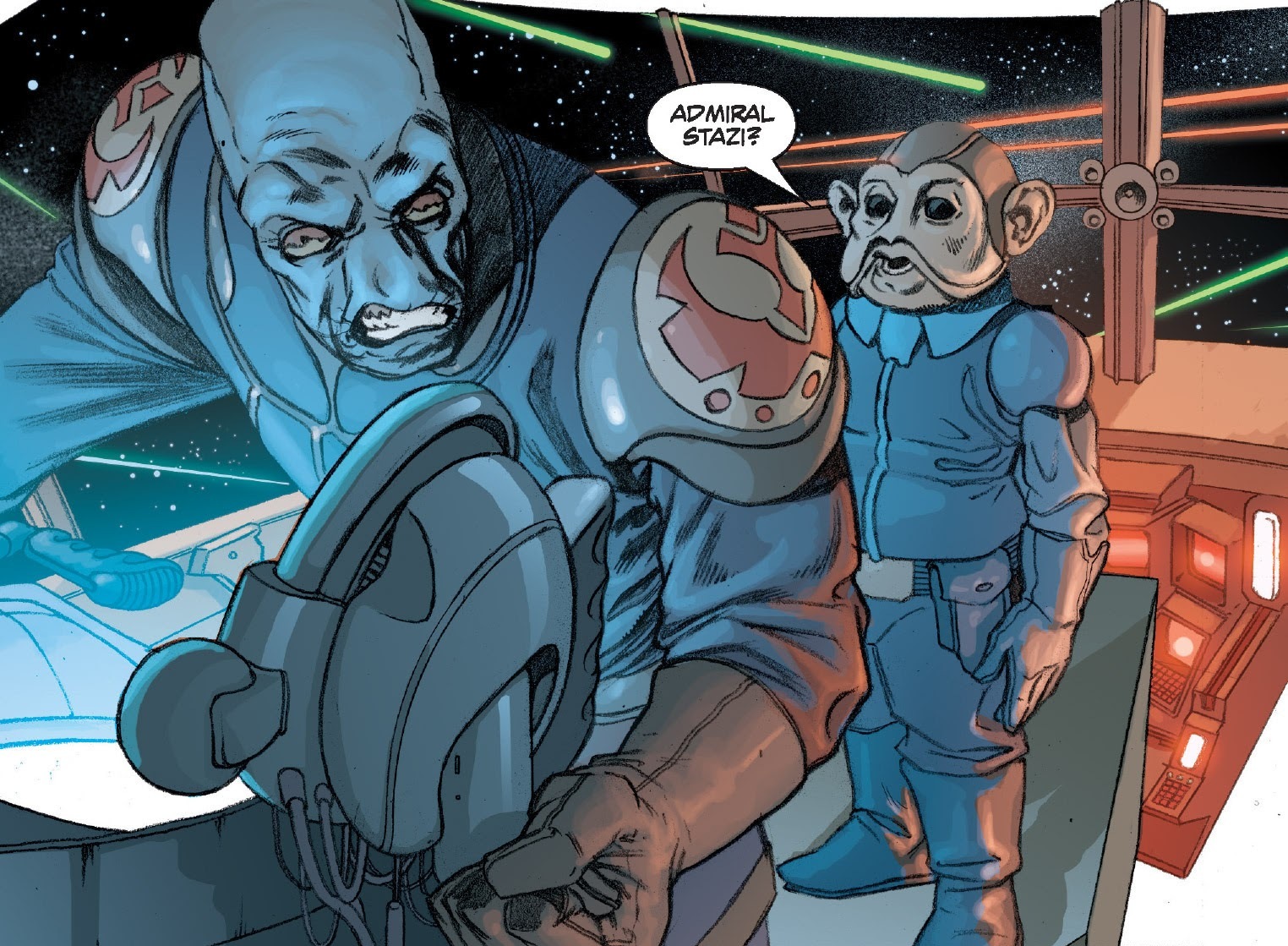 Following the defeat of the Sith Empire at Coruscant, Stazi became one of the three Triumvirs in the Galactic Federation Triumvirate. Following the Carreras Incident, Stazi was appraised of the new threat posed by the rogue Sith Darth Wredd, who wanted to destroy the One Sith in order to rebuild the Rule of Two. Later, Admiral Stazi and the Imperial Knight Master Yalta Val led a Triumvirate task force to liberate enslaved Mon Calamari and Quarren refugees in the Mon Calamari Shipyards, who had come under the thralldom of another Sith Darth Luft and his pirate associates. Stazi and Val succeeded in neutralizing the threat posed by the pirates and liberating the shipyards. This proved to be a popular action that helped bolster the fledgling Galactic Triumvirate in the eyes of the galaxy.
