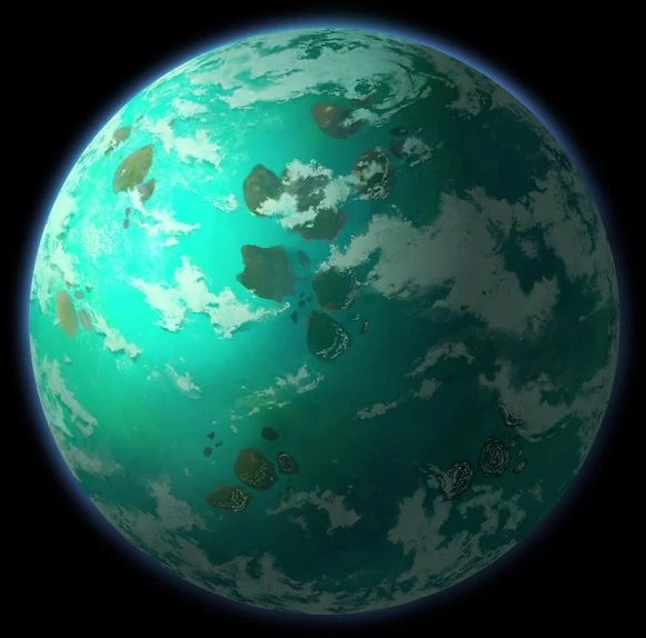 Glee Anselm was a planet[4] located in the Jalor system[2] within the galaxy's Mid Rim.[1] The planet's surface was covered in water, and it had no major landmasses.[2] No light reached the depths of the world's oceans, making the Nautolan people evolve to have dark eyes that could see details in the oceans' darkness.[6] The small islands dotting its oceans held jungles, mountains,[3] beaches, and grassy fields.[2]