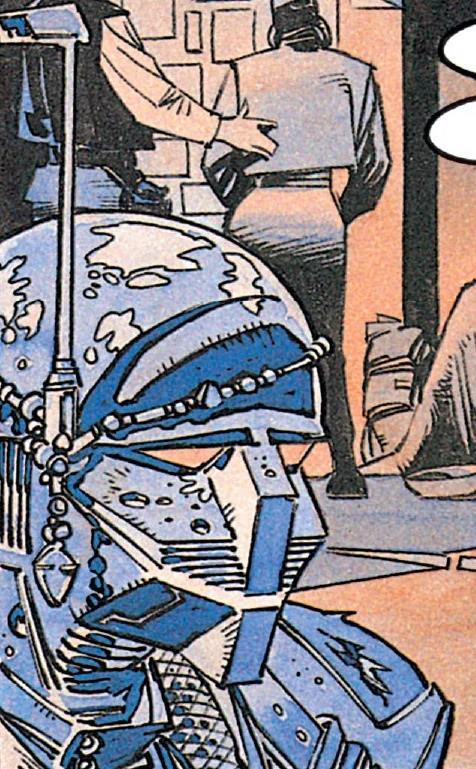 His body included parts from no fewer than six biological species and seven generations of droids and machines. It was unknown what his original form was.. An ancient Ithullan infantry helmet concealed whatever form his head may have taken; the only clues to what lay beneath were two glowing red photoreceptor eyes. Perhaps Gorm's most perplexing aspect, however, was his personality. While few of the beings he came into contact with lived long enough to tell of his character, Gorm was in actuality a coarse and boisterous being, even known to laugh callously at his prey before ending their lives. While loutish droids were not without precedent, this seemed to indicate that Gorm possessed the mind, at least, of a biological. For the most part, however, it was a rare individual who could conclusively identify a piece of Gorm. What few components were known are as follows: