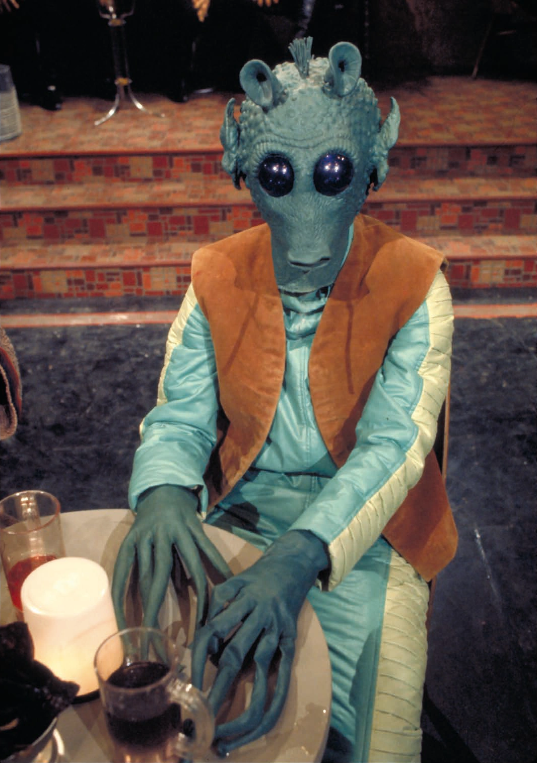 Blake played Greedo in the shots that feature both Greedo and Han Solo in the same frame. For Greedo's close-ups, a new articulated head was built for pickups at the end of the shoot, and Maria De Aragon was enlisted to play the Rodian.[30] The mechanism for Greedo's mouth broke just before he needed to be shot. Aragon was then asked to put a clothespin between her teeth to move Greedo's mouth, making Greedo come to life.[31] During pickups, Greedo's costume vest changes significantly, as do his hands. In the original shoot, Greedo has long, suction-cup tipped fingers, and in pickups, he has swollen knuckles and shorter fingers. The Greedo mask and tunic are currently on display as part of the "Out of this World: Extraordinary Costumes from Film and Television" in the Science Fiction Museum & Hall of Fame in Seattle, Washington.[30] Aragon claims that George Lucas practically saved her life when he saw her making odd gestures to signal that she couldn't breathe in the mask.[31]