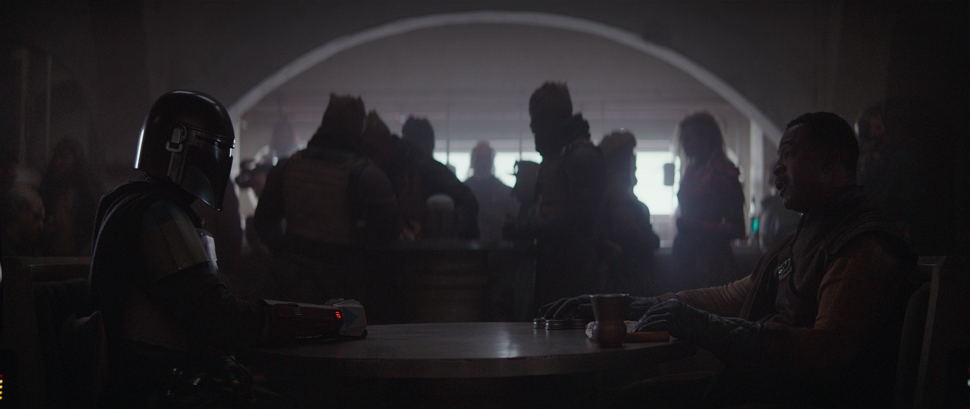 Greef Karga negotiates with Djarin on his next job at the cantina on Nevarro.