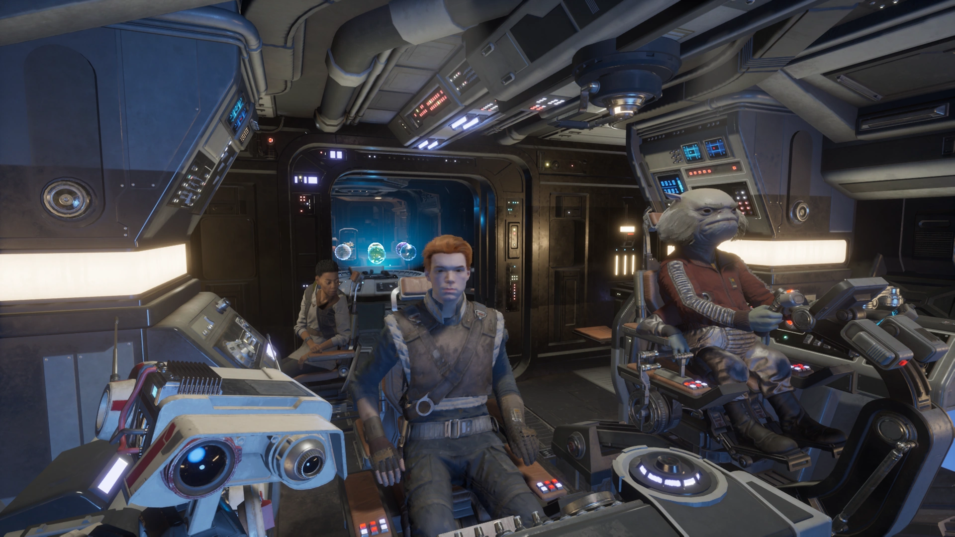 Greez and his companions Cal Kestis, Cere Junda, and BD-1 onboard the Stinger Mantis