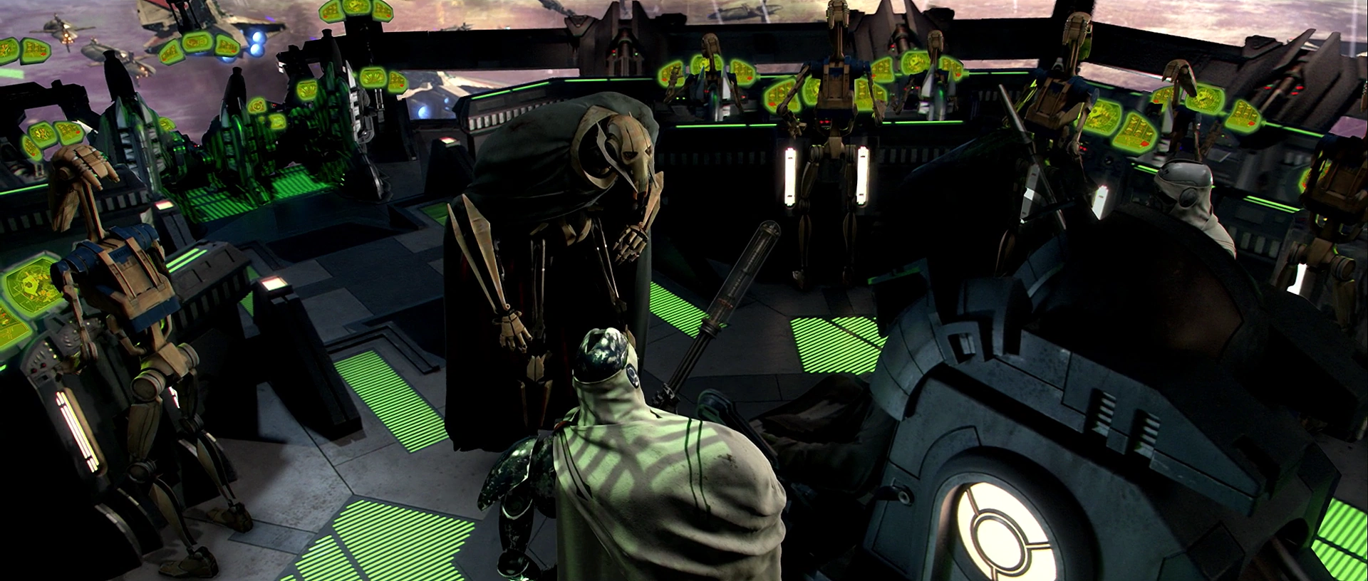 Grievous giving orders on the Malevolence bridge.