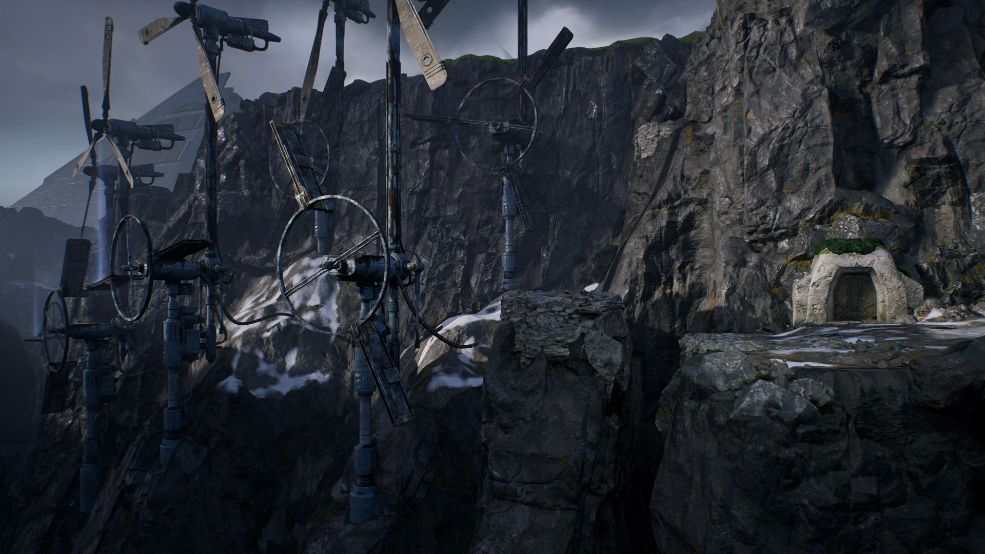 The Gusty Bluffs were an area of cliffside on the Outer Rim Territories planet Zeffo, known to be inhabited by phillaks. The high winds in the area led to the Turbine Facility to be constructed nearby. The area was in between the Turbine Facility and the Weathered Monument.[1] By 14 BBY[2], a monument constructed by the Zeffo Villagers was created as a landmark and a memorial for the dead. The area was also located on the route that Galactic Empire Stormtroopers took when taking relics from nearby Zeffonian ruins. In 14 BBY, Cal Kestis alongside BD-1, his companion droid, explored the area while trying to find the Tomb of Eilram. He later returned to the area after exploring the Tomb of Miktrull.[1]