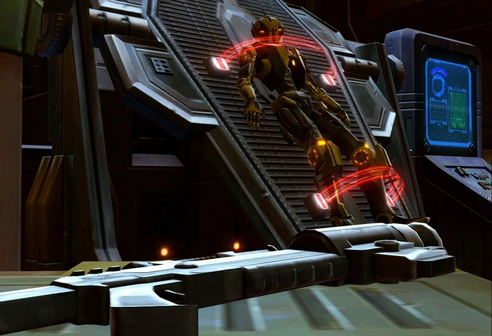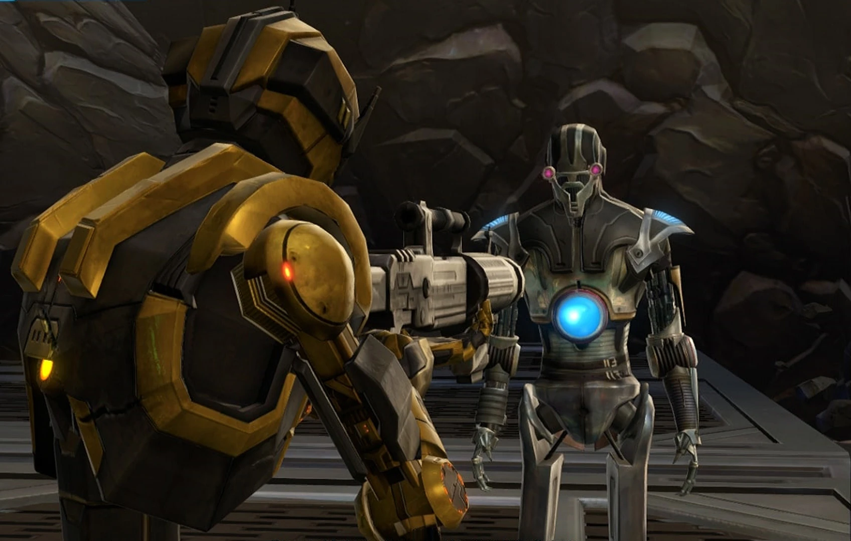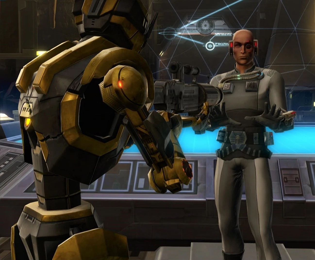 The damage done by Arcann's attack was initially deemed to be irreparable, but Dr. Juvard Illip Oggurobb, chief scientist for the new Alliance that had risen to fight against Zakuul, was able to rebuild HK-55 at his laboratory on Odessen, albeit with some modifications to his chassis. However, HK-55's memory core was not recoverable, resulting in HK's programming being restored to factory settings and complete loss of memory to any events prior to his reactivation. Dr. Oggurobb called on the Outlander to assist in making the final calibrations to HK-55's security and assassination programming. The Outlander initially found HK-55 in the research lab, blasting every droid in the room to scrap while the terrified lab technicians scurried out of his line of fire, having opened fire before his test was ready to secure a tactical advantage. With the Outlander's aid, HK-55 conducted a series of scenarios to refine his targeting subroutines to the Outlander's satisfaction.[2]