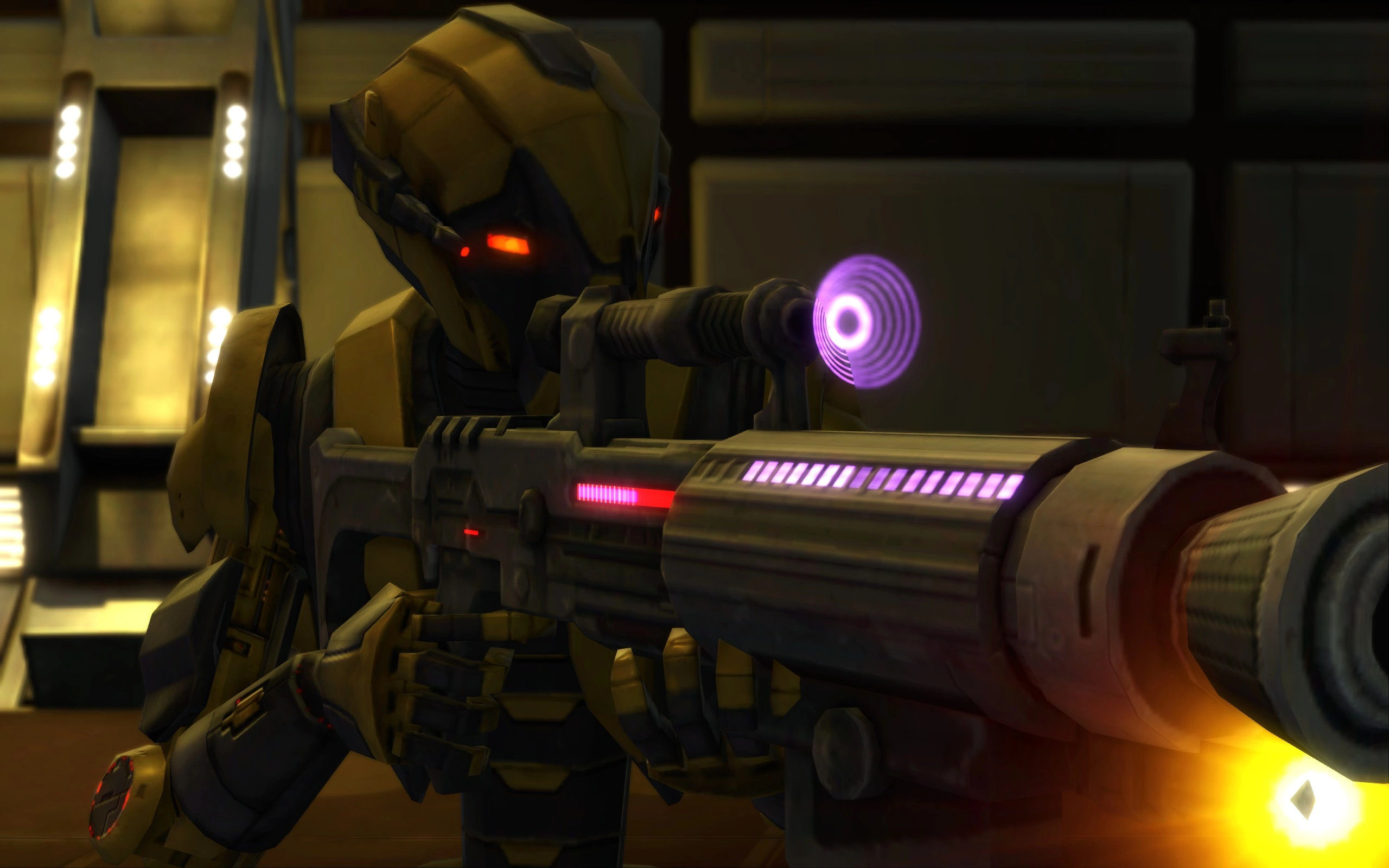 HK-55 was a HK-series assassin droid that served the Sith Lord Lana Beniko during the conquest of the galaxy by the Eternal Empire and afterwards. He was programmed as a bodyguard, but also functioned as an assassin droid when required. After his destruction during the Battle of Asylum, he was eventually rebuilt and brought into the service of the Outlander.