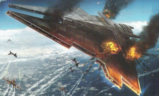 In 3678 BBY, several Harrower-class dreadnoughts were part of the Imperial fleet that defended Korriban from a Republic assault in 3678 BBY.[18] In 3671 BBY, Harrower-class dreadnoughts were among the vessels making up the Imperial fleet that attempted to capture the Mid Rim world of Bothawui—a Republic victory that became known as the First Battle of Bothawui.[9] At least three dreadnoughts were present at the Battle of Alderaan in 3667 BBY[19] and Harrower-class dreadnoughts also saw use during the Rim Campaign of 3661-3660 BBY—at least two dreadnoughts were destroyed at the end of the lengthy Battle of Ord Radama in 3660 BBY.[2] A powerful prototype Harrower-class known as the Voidstar disappeared during the Great Galactic War, though it was later discovered floating as a derelict during the subsequent Cold War.[20] Harrower-class dreadnoughts such as the Scream of Ragnos made up much of the fleet that conducted the Sacking of Coruscant in 3653 BBY,[12] a battle that brought about the Treaty of Coruscant and the end of the war.[21]
