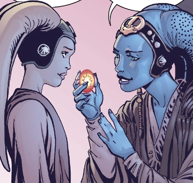 Aayla Secura giving the Heart of Fire to Xiaan Amersu.