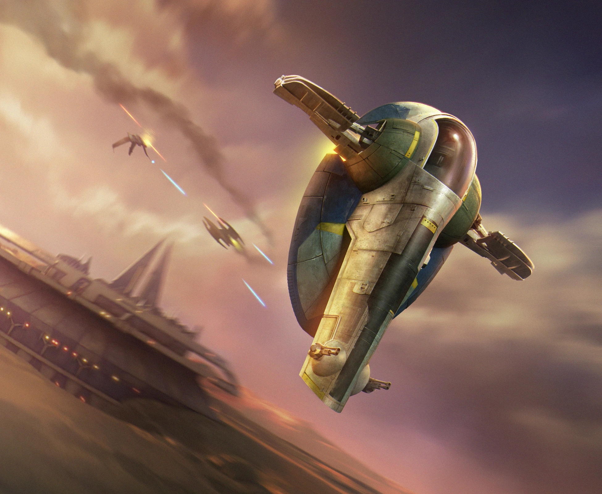 After successfully getting Jiro to send most of his men to the bogus coordinates of the Blood Bone Order's fleet, Rhayme and Ventress took out most of the remaining pirates before being interrupted by the return of Hondo himself. Rhayme dueled the Weequay captain with Ventress' lightsaber, eventually disarming and holding him hostage until the Steady On's cargo was handed over to her, upon which she and Ventress left the system.[28] At some point towards the end of the war, Fett reclaimed ownership of the Slave I[29] from Ohnaka, who also mentored the young man in the bounty hunting profession for a time.[30]