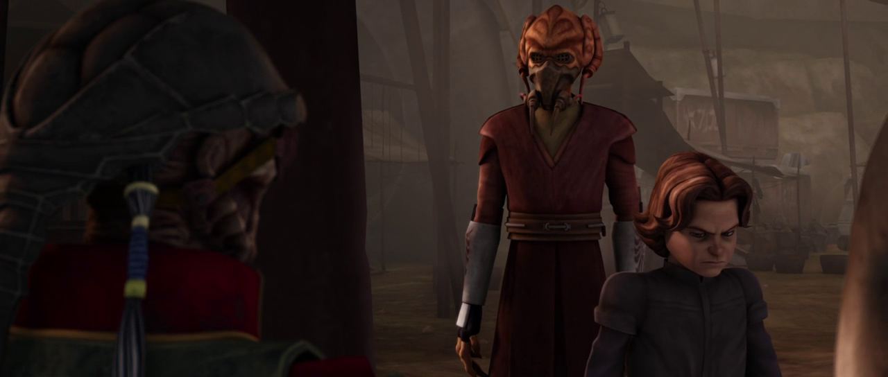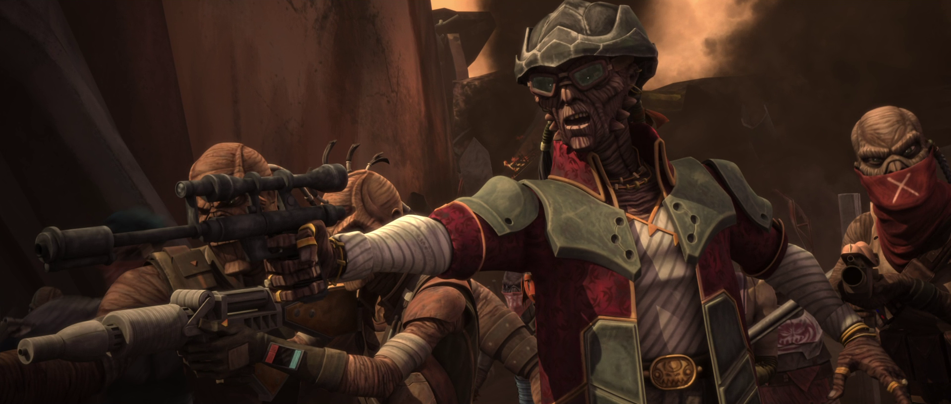 Later in the war, Ohnaka—at the behest of the Jedi General Anakin Skywalker—delivered several rocket launchers to rebel forces on Onderon during their civil war when the droid gunships proved to be too much for the rebels. Ahsoka was surprised to see him, and he quickly fled the planet along with his pirates when a droid patrol attacked the group.[24]