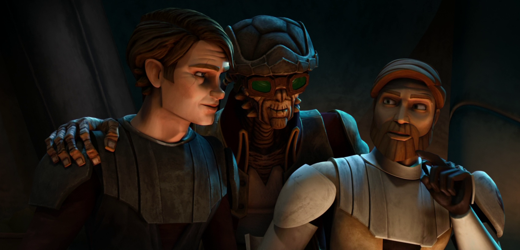 Ohnaka converses with Anakin Skywalker and Obi-Wan Kenobi.