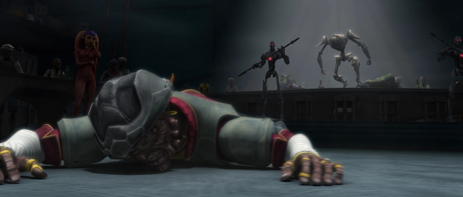 Hondo Ohnaka stayed at his pirate base while his pirates attempted to recapture Ahsoka and her younglings in the wilderness. During this time, the pirate captain was subsequently visited by the Separatist military leader General Grievous and a droid army. Grievous opened a holo-communications channel with Count Dooku, who conferred with Hondo. In retaliation for his imprisonment during their first encounter, the Separatist leader had come to take over Florrum and to dismantle Ohnaka's arsenal. Despite his protests, Hondo was incarcerated by the Separatists who proceeded to dismantle his base and vehicles.[23]